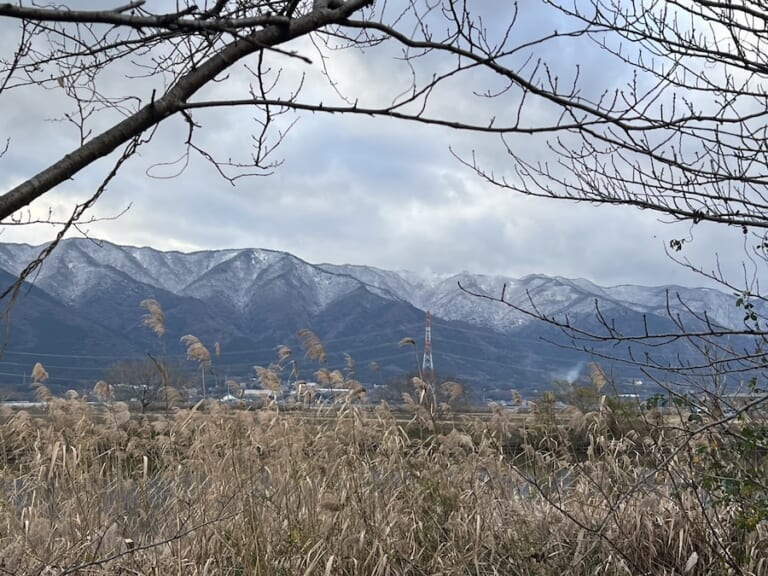 道中では、五三川で半日釣りをするもノーバイト…。 五三川の西側に連なる山は積雪も。