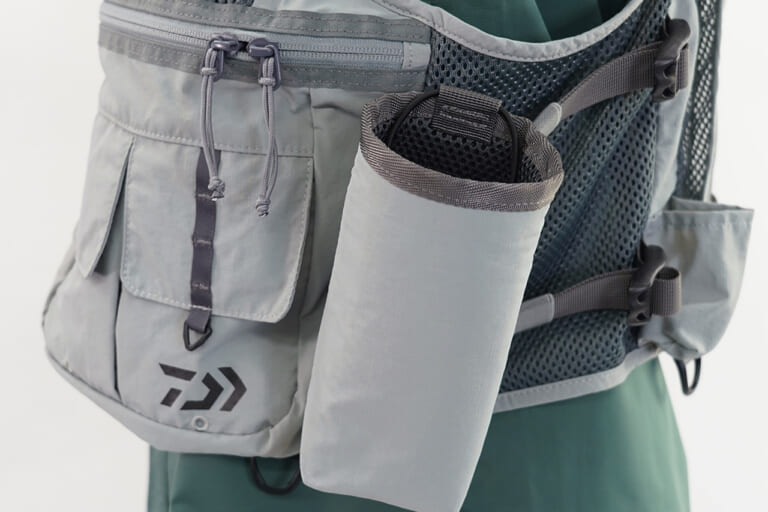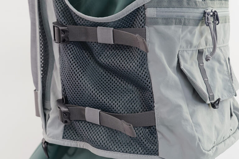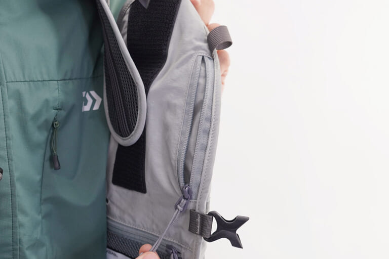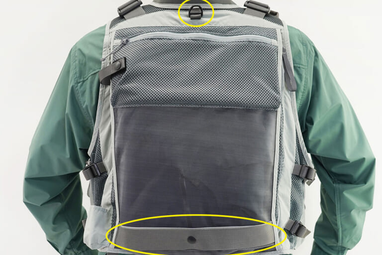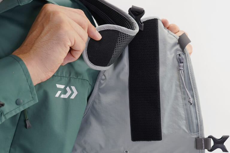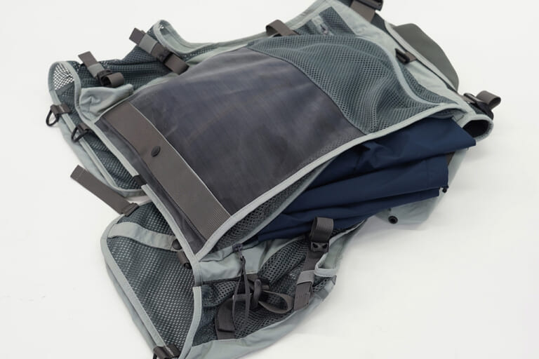 背面には用途の異なる2種類のポケットを配置。上部は携帯食や小物の収納に最適な深さで、下部はレインウェアなどの大物を収められる大型ポケットを装備。いずれもメッシュ素材を採用することで通気性が大幅に向上し、長時間の釣行でもムレを軽減する。