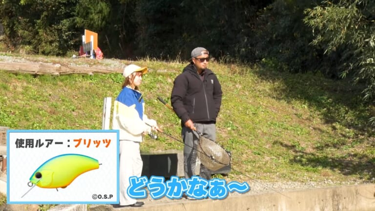 そこで岩花さん、小坂井さんの2名は馬場さんのアドバイスでジャッカルのマイクロベイト系ワーム「エリーゼ1.5」を使って何とか口を使わせる作戦へ。