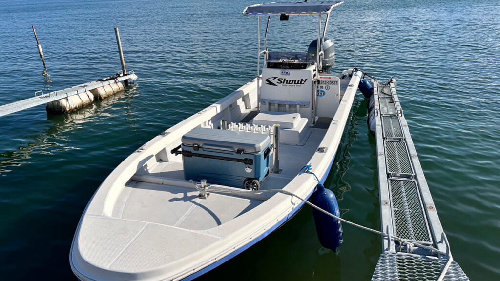 マリーナに到着し、陸上に保管されている船とご対面。率直な感想は、「思っていたよりもかっこいい」「意外と大きいな」というものでした。後になって気づいたことですが、陸に上がっている船は、海に浮かんでいる時よりも1.5倍ほど大きく見えます。