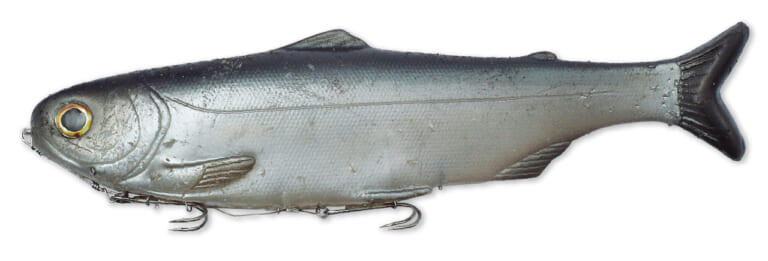白川「よくあるスイムベイトの素材ではウグイやハスの動きが出せなかったので硬くしています。竿と一緒ですね。今までのスイムベイトが低弾性だとしたら、これは高弾性。ハードルアーに近いです。そもそもアメリカのスイムベイトは放流トラウトの弱々しい動きなんですよ。ニジマスとハス、ウグイでは泳ぎ方が全然違いますからね」