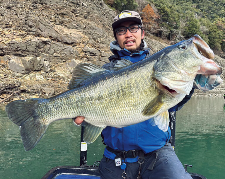 オカピー「時期は冬から春にかけて、スポーニングに入るまで。場所は岩盤、立木。特に立木が多いですね。立木の向こうに投げて、上を引くイメージです。レンジもそんなに入れない。中層を引いて、浮かせて食わせる釣り方です」