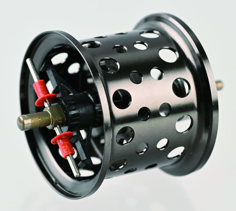 Φ32ミリジュラルミン製ノーマルスプールには回転レスポンスに優れた2点式遠心ブレーキかつ8lb×50m収納の浅溝を採用して、軽量なルアー&リグを手返しよく軽快に撃ち込むことを可能に。注目は、別売のオプショナルスプール。6点式遠心ブレーキは多彩なブレーキの微調整を可能にする一方で、12lb×100mのラインキャパ。