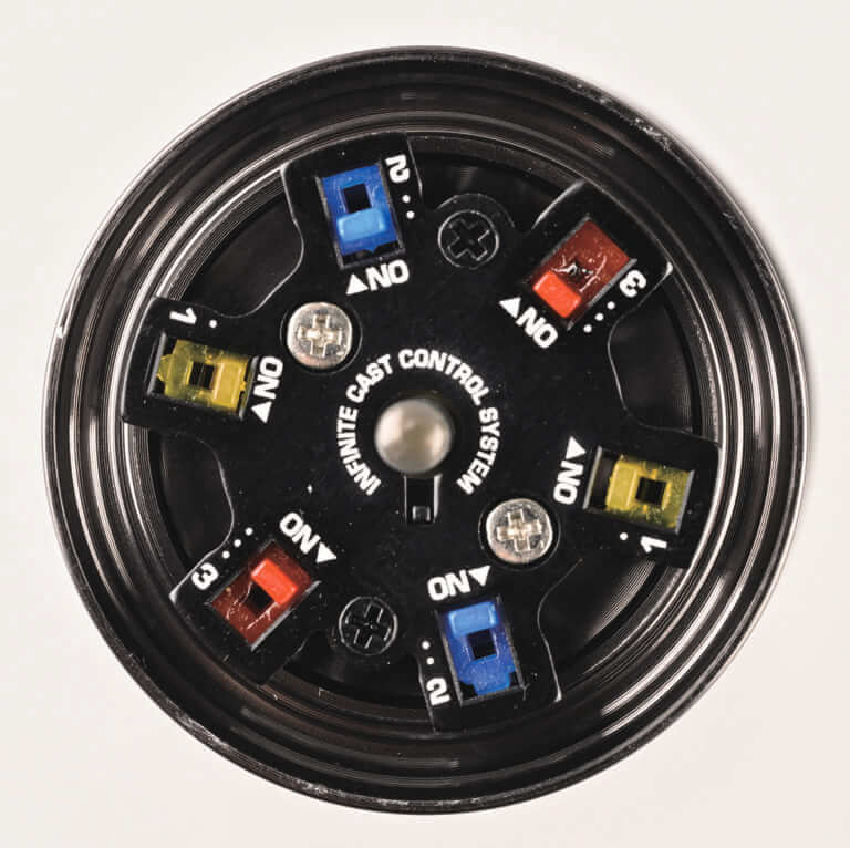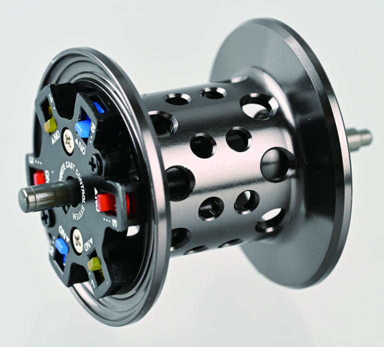 ベイトフィネス用ノーマルスプールには2点遠心ブレーキを採用。ブレーキシューは赤色(強)のほかに青色(弱)も付属している。一方、オプショナルスプールは3サイズのブレーキシューを搭載した6点遠心ブレーキ『INFINITE CAST CONTROL SYSTEM』に注目。黄1・青2・赤3を対角線上に備え、数字が大きくなるほどブレーキ力が強い。
