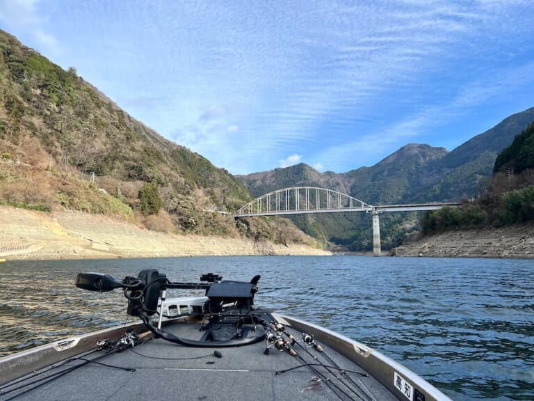 まずは、バスボートで走れる所まで…と、気づいたらメインのバックウォーターの上流に。バスボートのスピードに、減水していることも相まって、フィールドが小さく感じちゃいます。
