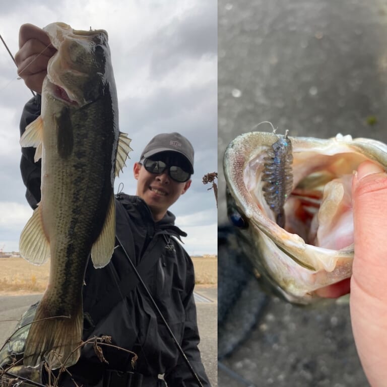 その後、同じような場所や、過去2年で良かった場所で計5バイトを得るもすべて掛からず…。後ほどペリー大西さんから聞いた話では、シャローに居るバスは大型ベイトフィッシュを捕食しているものの食い切れていないことが多いとのこと。トレブルフック仕様を試せば良かったと、後から後悔しています。