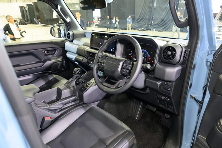 コックピットはほかのランドクルーザーと同じように水平基調のデザイン。オフロードでの視認性を高めたインストルメントパネルに、武骨さと実用性を兼ね備えたコックピットだ。