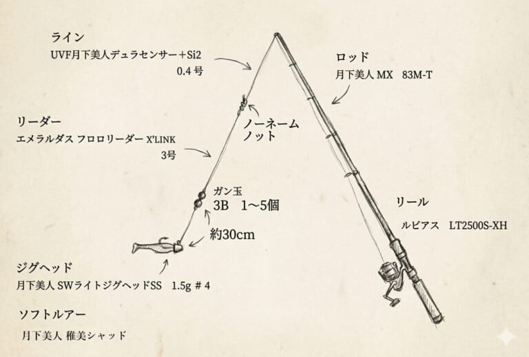 ジグヘッドは「月下美人ジグヘッドSS」1.5g#6にワームは「月下美人 アジングビーム バチコンカスタム MID」の3インチ。