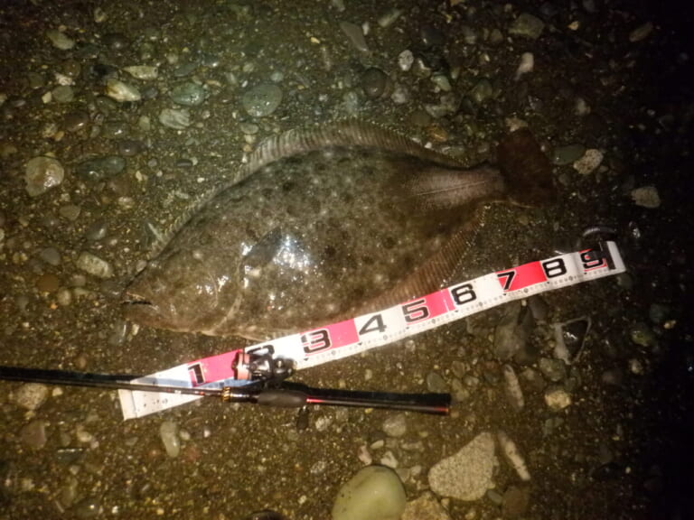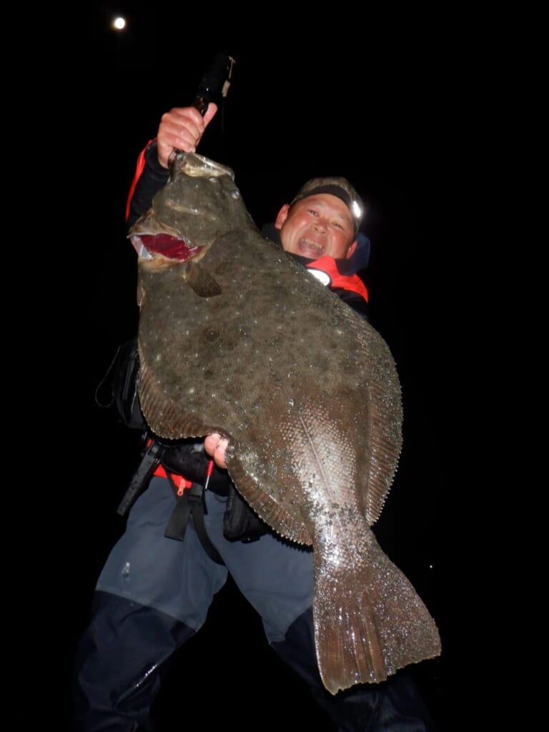 20分ほどのファイトの末、ようやく波打ち際までくると月明かりに照らされたのはヒラメ!それもデカい!!