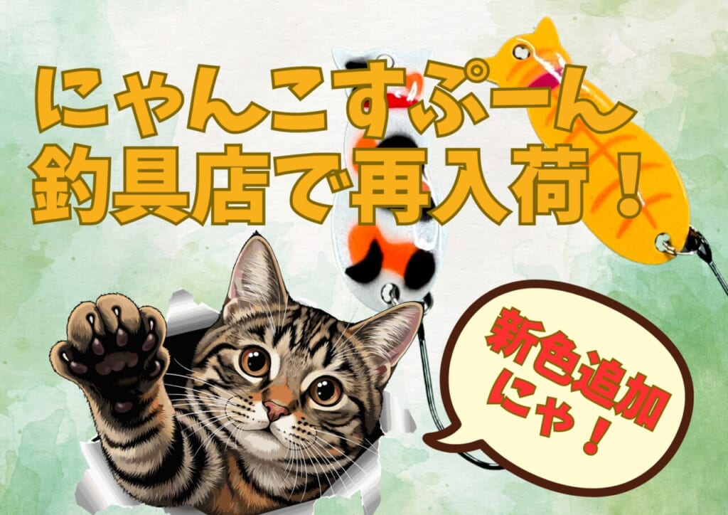 おかげさまで、昨年の10月に販売して以来、欠品しておりました『にゃんこすぷーん』。元々は3COINSさんの釣りアイテム企画にルアマガのアイデアが採用されて販売されていたルアーなのですが、企画終了に伴い市場から消えてしまったので(3COINSさんのネット販売は瞬殺)、であるならばと、アイデア元のルアーマガジンで『ねこすぷーん』から『にゃんこすぷーん』に改名し、釣具店さんで販売することになったのが発端。