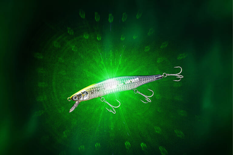 光が一方向に強く戻り、遠くのフィッシュイーターにも存在をアピールする効果が期待できるだけでなく、強い光と消える瞬間の「明滅効果」を組み合わせることで、フィッシュイーターがベイトを探す捕食本能に訴えるアピール力を発揮。