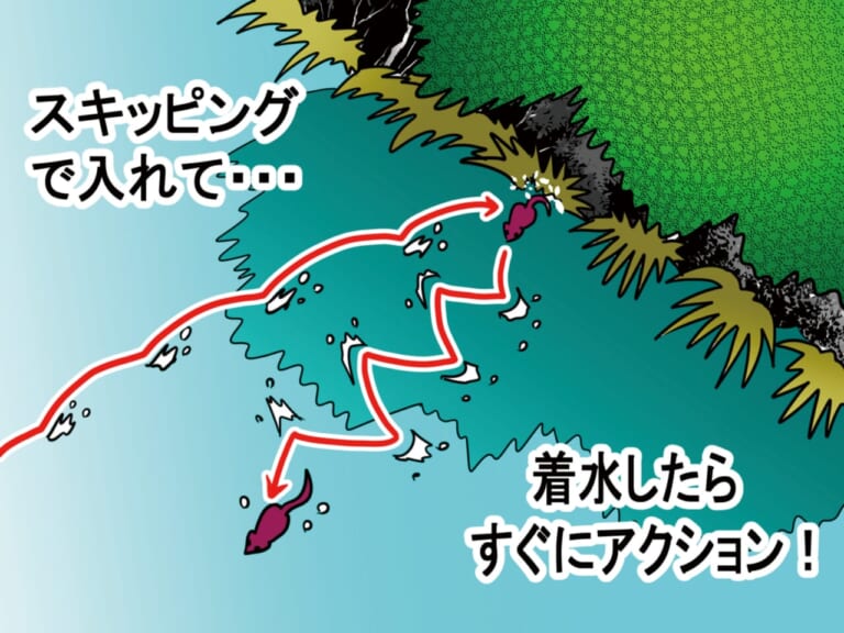 「着水後は絶対に待たないほうがいい。着水してすぐ動かし始めるくらいのスピード感が大事です。スキッピングでバスにスイッチが入るので、着水後に待つとそれが台無しになってしまいます」。