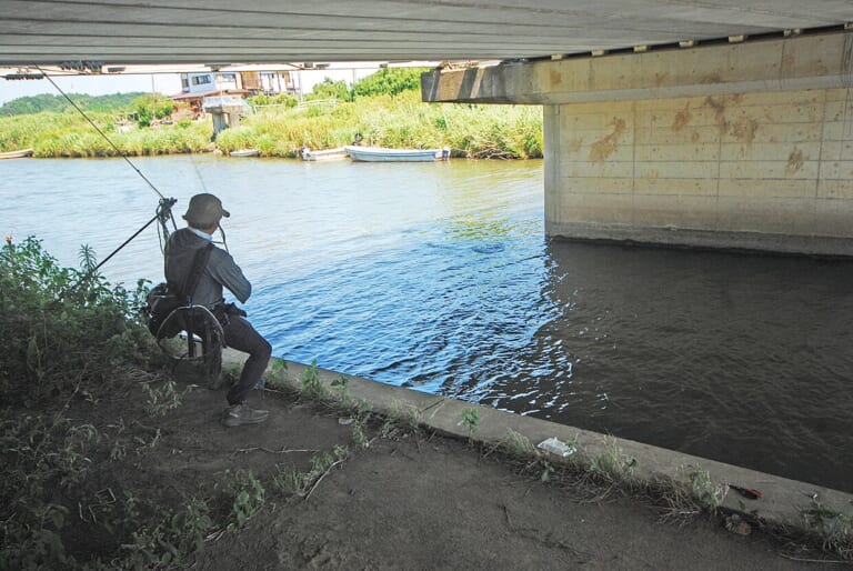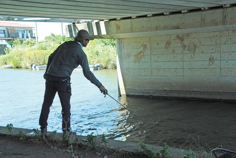 エビソンボーイのネイルリグを水門奥へスキッピングでねじ込み、シェイキングで水面直下を探ること5〜6投。しかし反応がない。推定7投目、キャスト時にネイルシンカーが抜け飛び、やむなくトップで通すと水門出口まで追ってのバイト。レンジの差なのか、それとも何度でも通すことの大切さなのか。