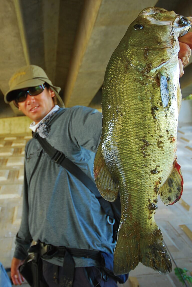 水門奥からコイらしき捕食音を聞くや、エビソンボーイを5 ~ 6投。すると不意にネイルが飛ぶ。それまで水面直下でアクションさせていたが、表層に切り替わった途端、シェードの出口まで追尾からの猛バイト!