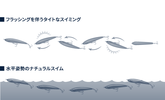 スピーディに泳がせてもアクションが破綻しないので青物にも見切られにくく、アピールからバイトまで効率的に持ち込むことができる。