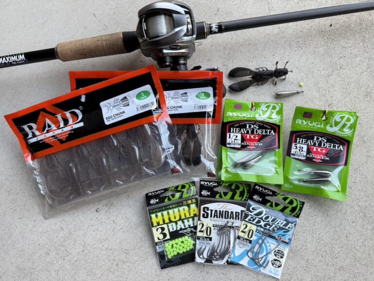 早明浦ダムでのMVPとなったエグチャンク3inchフリーリグのタックル&小物類。