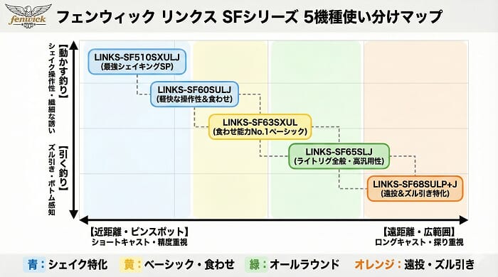 コンセプトは既存の「SF63SXULJ」に近いですが、今作の「SF510SXULJ」はショートレングス化による操作性重視の設計です。使用ルアーはほぼ共通ですが、以下のような使い分けがおすすめです。