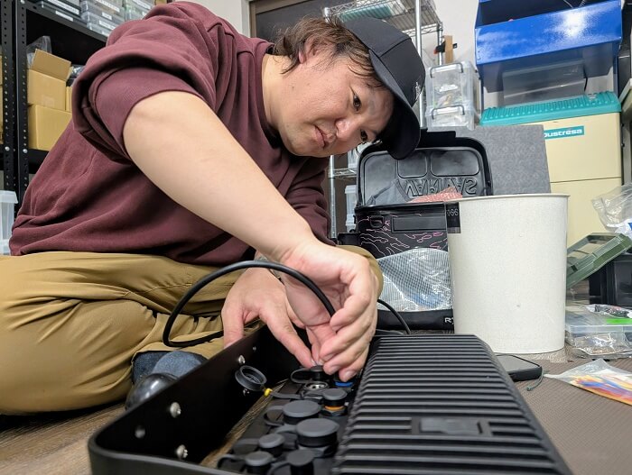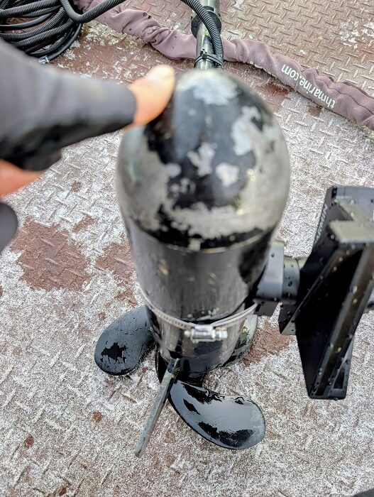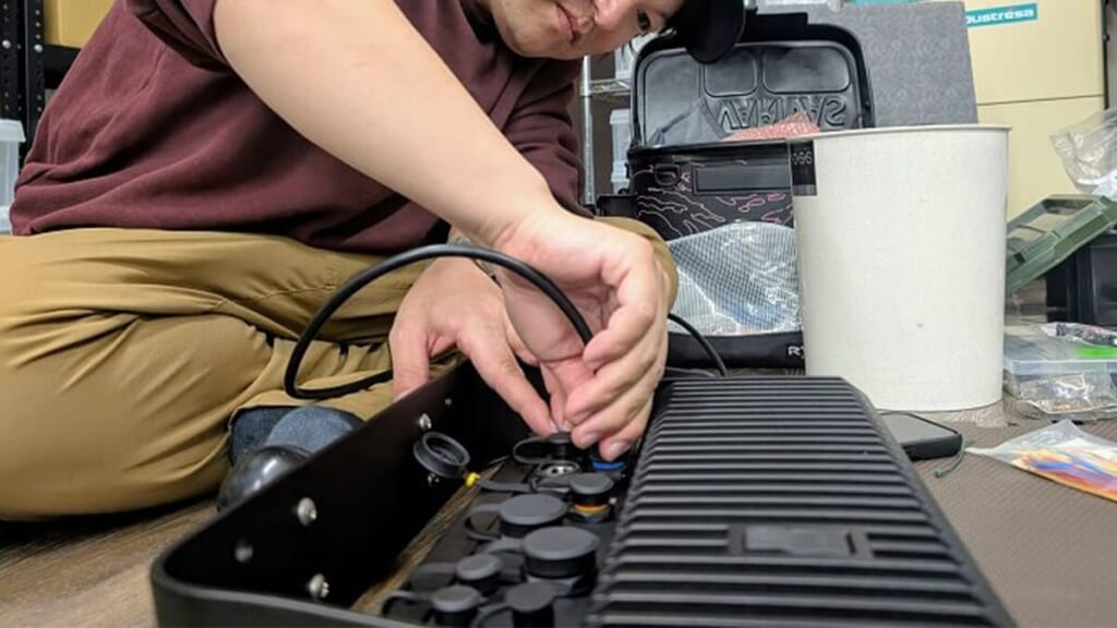 フィールドスタッフの千葉陵平が配線を組んでくれ、ついでにエレキのスケグがあらぬ方向へ曲がっていることが発覚!どうりで真っすぐ進まないワケだ。心当たりはあって、昨年ゲスト参戦した大会で急いで帰着に向かう最中、沈み木に激突した時ですね。