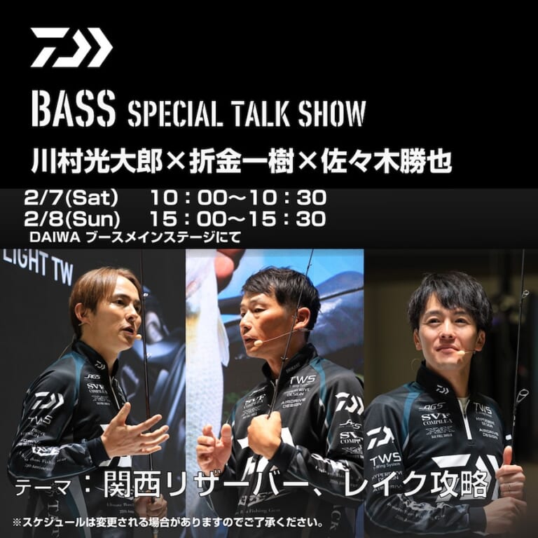 トークショー以外の個別でもロッドやリール、ルアー等の話に限らず関西のフィールドのお話もウェルカムですので、皆さんとお会いできるのを楽しみにしています!