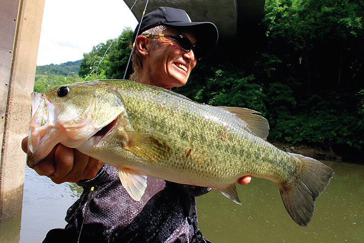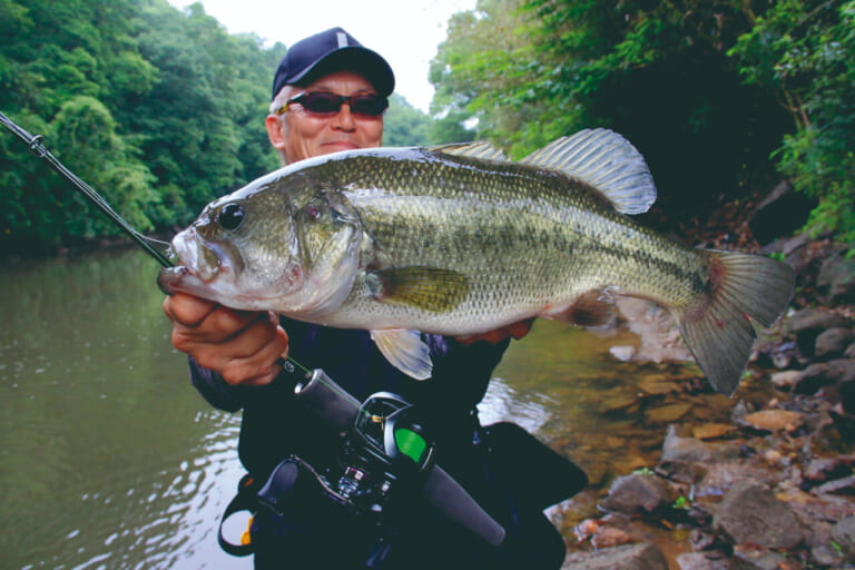 リザーバーの川筋にエントリーし、沈み蟲のネイルリグで次々とバスをキャッチ。「掛けたあとはバレる気がしない。竿が勝手にいなしてくれるのがわかるから、ヤバイなって思う瞬間がないのがエエね」。