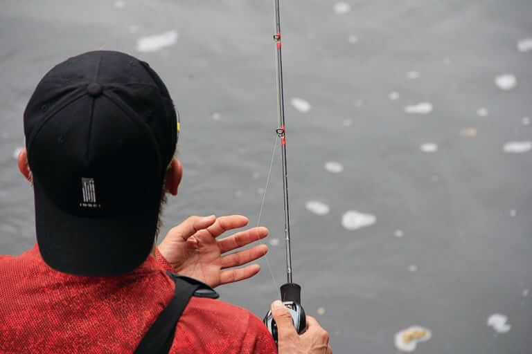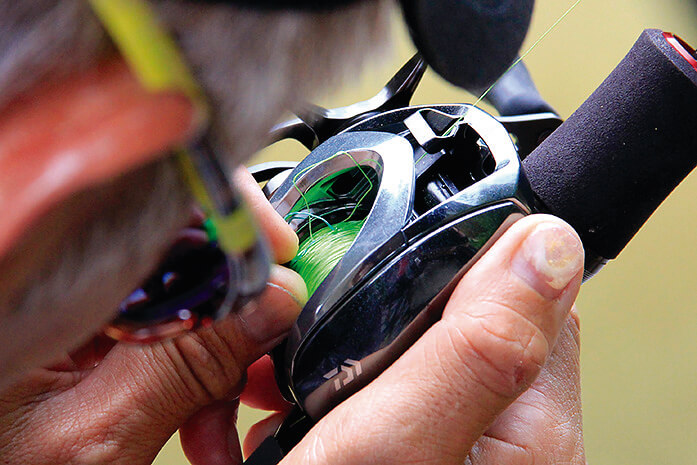 PEラインでのバックラッシュの直し方のコツは、まず何はなくともラインを強引に引っ張らないこと。さらにラインを食い込ませてしまったら取り返しがつかなくなる。「ラインが束になっているところを、とにかくほぐしてやる。このときにラインが乾いていたら熱が生じてキレやすくなるので、湿らせてあげるとより良いですね。バックラッシュを直したあとは、リールを下向きにしてラインを巻き取りましょう。緩んだラインがハンドルなどに巻き込まないのでおすすめですよ」。