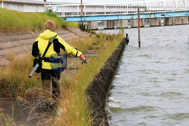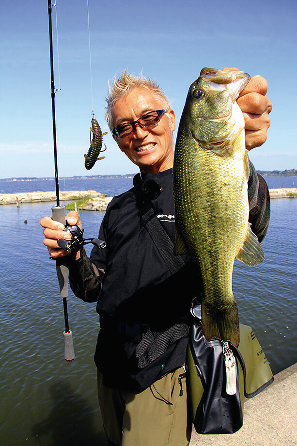 霞ヶ浦水系ではテクトロも多用した村上。フルソリッドの柔軟性があれば、足元で急にバイトしてきてもフックアップさせやすい。護岸の多いフィールドでぜひ試してみてほしい。