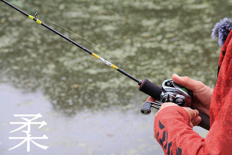「軽いルアーは力を入れないほうがよく飛びますよ。普通の竿はロッドのキャスト時のハニースポットが狭いんだけど、フルソリッドは竿全体が曲がってくれるから、その幅も広い。リールの限界以上の軽さのモノも投げられる。要するに、よく曲がるから軽いルアーも飛ばせられるんやね。竿が曲がった反発力でリールのスプールが回って、それでルアーが飛ぶというメカニズムを体で理解できれば、この竿のポテンシャルを最大限に活かした飛ばし方ができるはず。フルソリッドのベイトシステムでうまく投げられるようになれば、どんな竿でも投げられるようになってるはず。力を入れなくてもちゃんと飛ばせられることのできる技術やね。タックルバランスがバシッと決まれば、ハード、ソフト問わずいろんな遊び方ができますよ」。