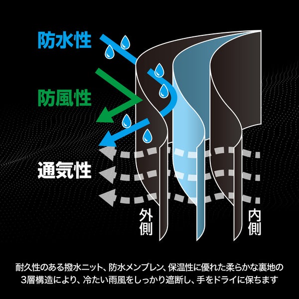 このグローブは、素材別で3層に分かれた構造を採用。外層には動きやすいニット素材を配し、中層に湿気を排出しながら水を通さない防水メンブレンを挟み込んでいる。内層には保温性の高い裏地素材にすることで、動きやすく、防水・防風・保温をすべて高い次元で両立した。