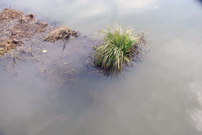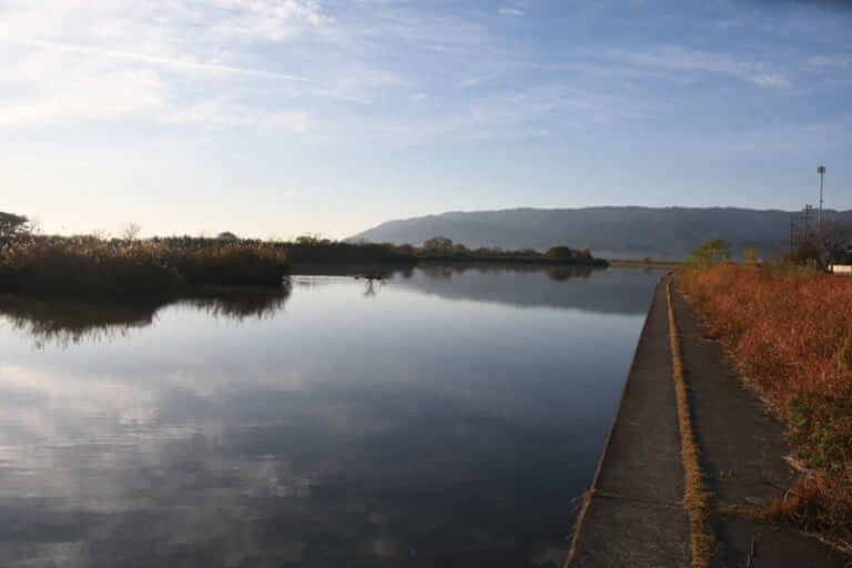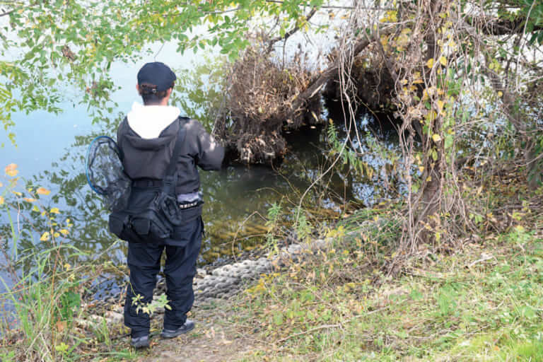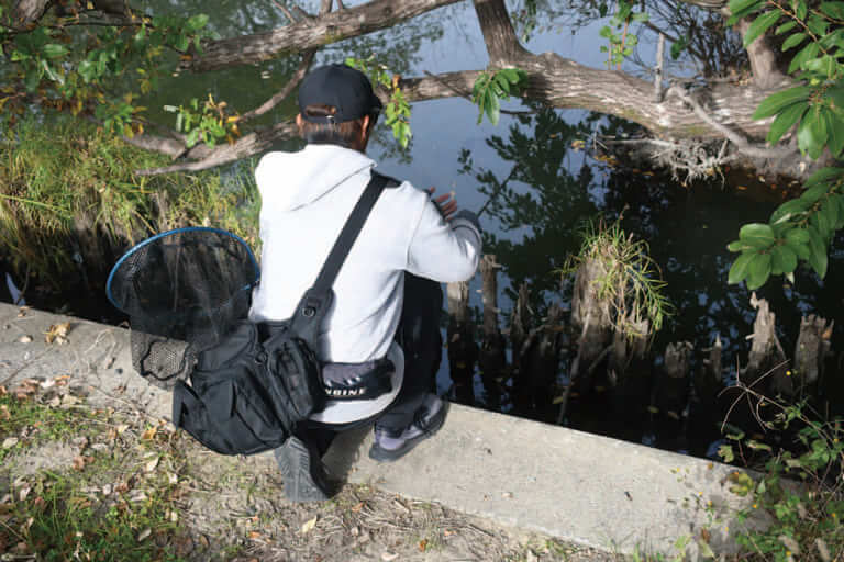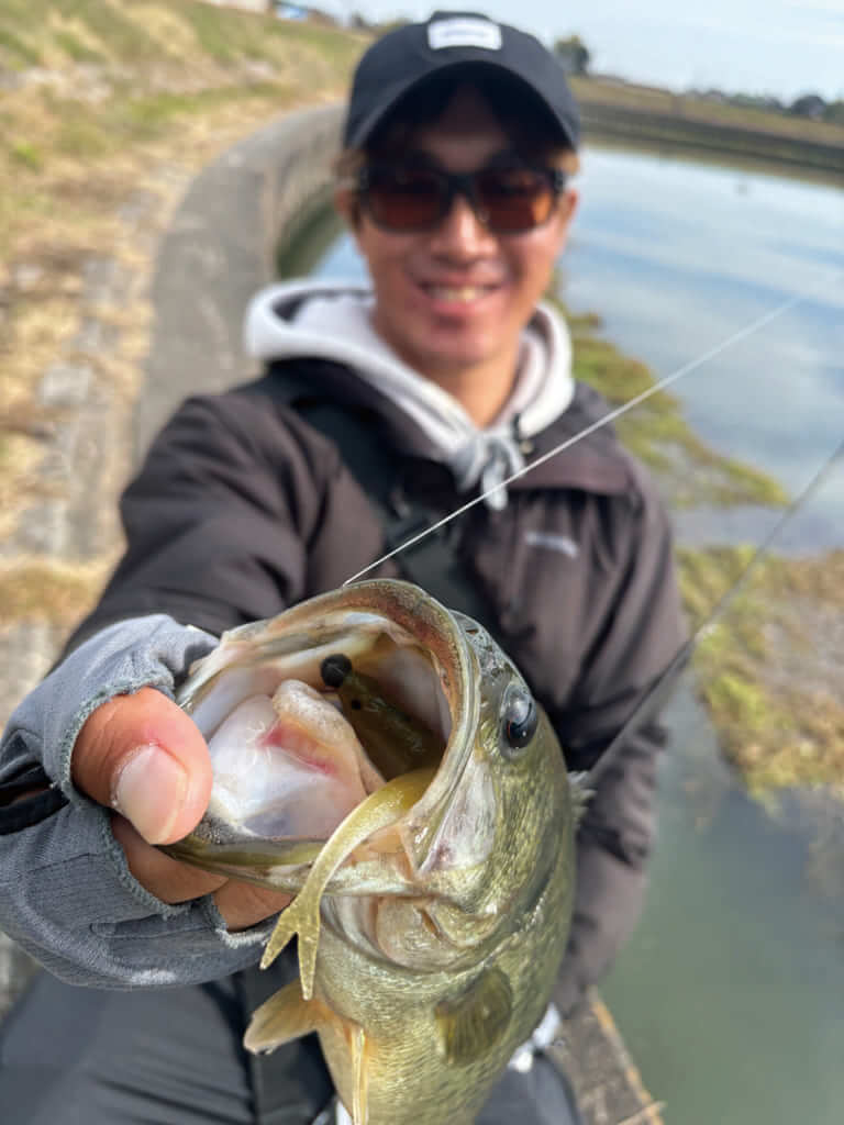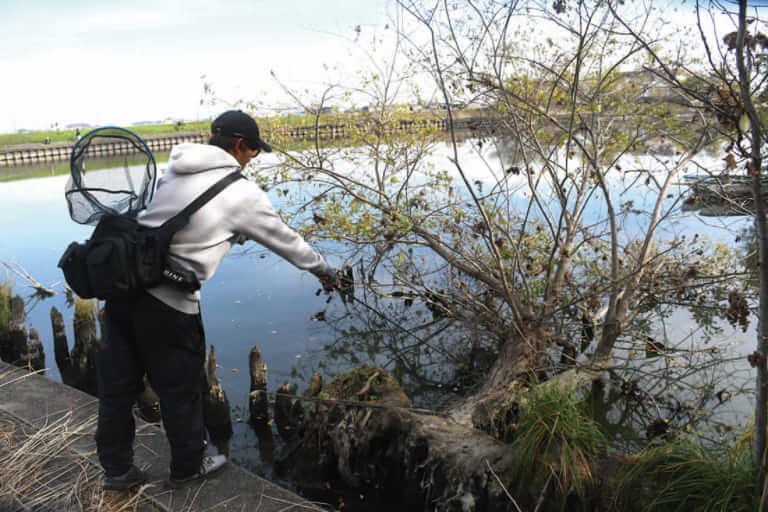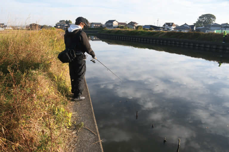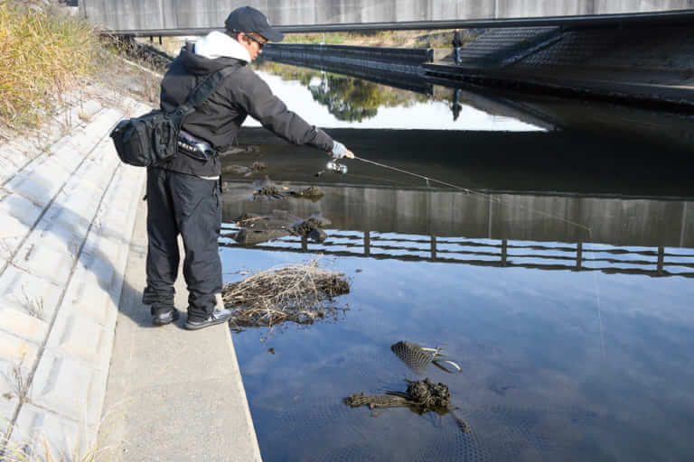 「大江川・五三川は全体的に浅いので、そのなかでもより深い場所に冬になるとバスは集まってきます。川幅が広がっていて、水深があって、ボトムが固くなっているような場所ですね。冬のボトムでじーっとしているバスは、ねちっこくやっていけば釣れるは釣れます。それよりも僕が狙っているのはフィーディングの魚. 朝マズメや水温が上がる11時以降、夕マズメなど、冬でもフィーディングで動く魚はいて、シャロー側の護岸やブッシュなどに差してくるんです。このバスのほうがコンディションがいいですよ」。