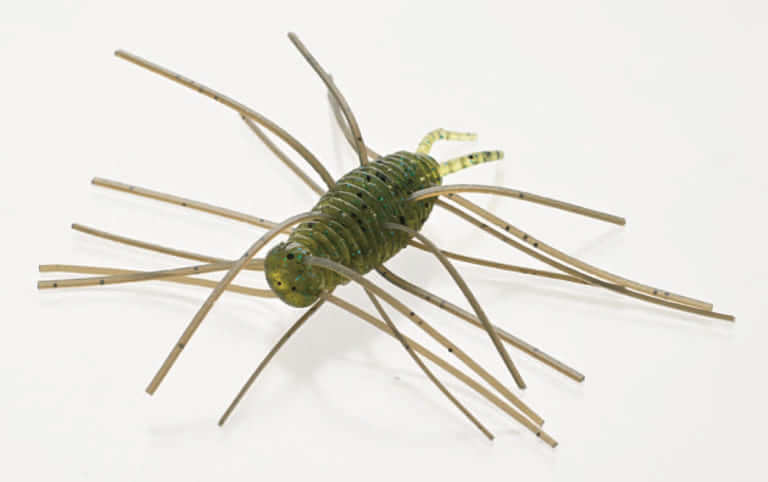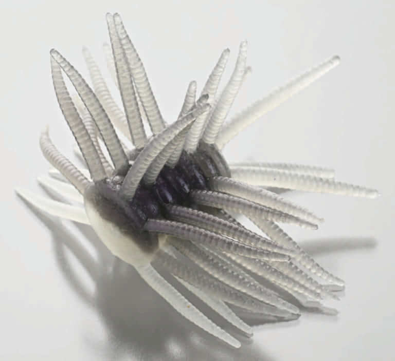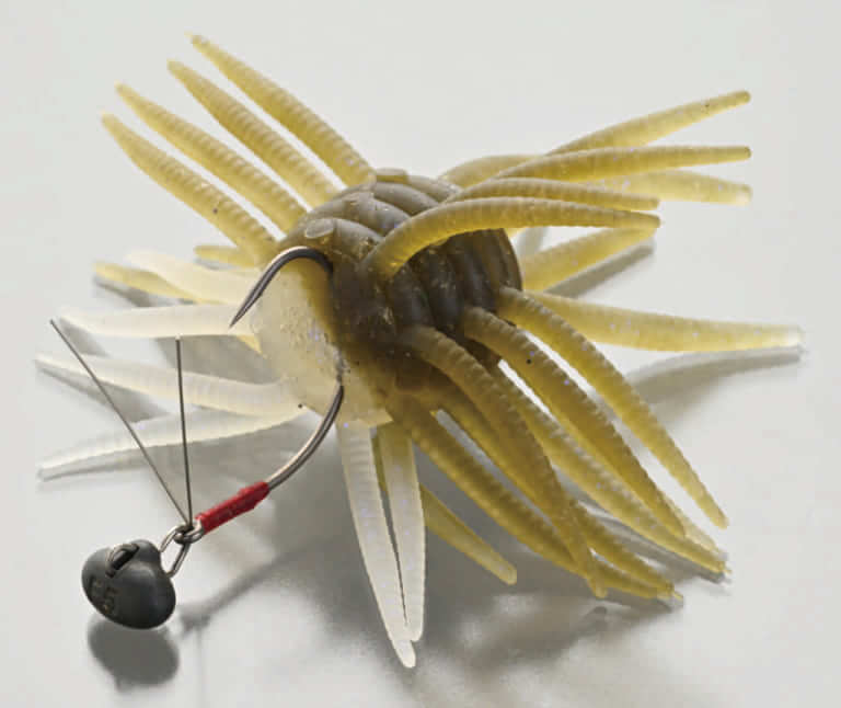 ボリュームのあるエラストマー素材の多毛系。フォール中にすべてのパーツが細かくブルブルと震えて、強波動でアピールしてくれる。厚みのあるボディが水を押してくれるので、大江川・五三川などの濁ったフィールドで活躍。また強風下など荒れた状況で普通のワームには気付いてもらえないような場合でもバスにアピールする。