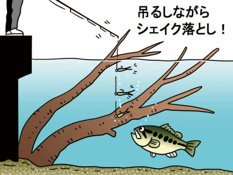「低水温になってくるとゴージャスなブッシュの下にボーッと浮いているバスが増えてきます。そういったバスに対して、目線より少し上で食わせるのに効果的なのがマイクロ吊るしです。大きいルアーを入れても反応しないけど、2inクラスのワームを入れればつい口を使ってしまう。ブッシュに杭などが絡んでいるような場所に入れて、上から徐々にシェイクしながら落としていくイメージ。普通にスモラバなどを吊るしで誘っていくのと同じですね。感覚的に、水深の半分くらいまで落としていけばOKです。1mの水深だったら50cmまでとか。ボトムまで落とす必要はないです。冬はボトムのほうが水温が低かったりしますし、冬でもカバーの下にサスペンドしているバスは多いですよ」。