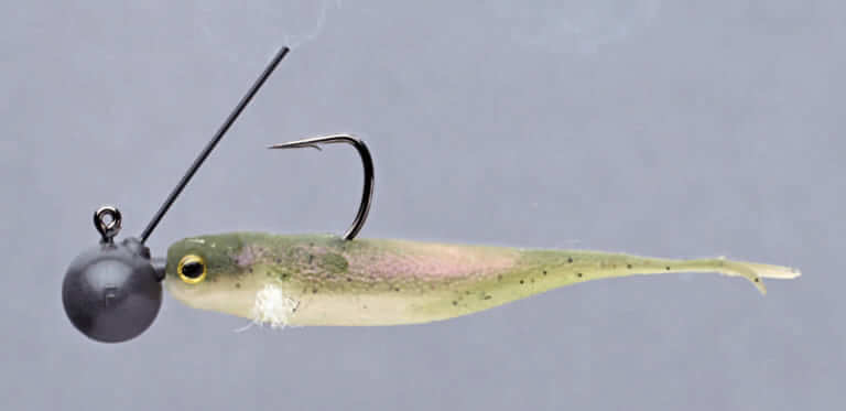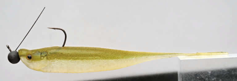 エラストマーの動きのリアルさを残しつつ、レンジキープしやすいようにした、5inサイズの小魚系ワーム。ベリーに塩を配合することで、約7.8gの自重になっている。フックはシャンクがボディの背中面にくるように挿す。また、下顎は少し上を向くように挿すとロールアクションの調節がしやすくなる。