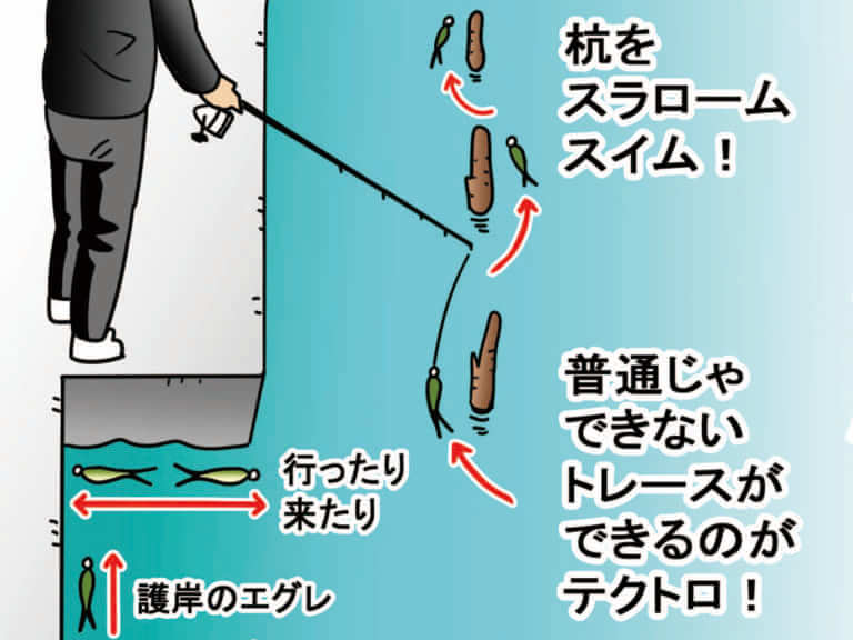 護岸のえぐれがあったら、そこを行ったり来たりさせたり、杭と杭の間をスラロームさせるように引いたり、ルアーをキャストして引くだけでは決してできない攻めが可能なのがテクトロだ。「とこどろこで沖に逃したり、壁際に追い込んだり, アングラーの自由自在に動かせるのがテクトロの利点です」。