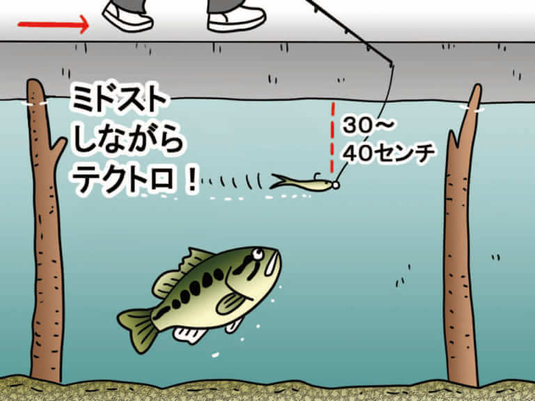 護岸やそこに平行して入っている杭の横を、シェイクしながらゆっくりとテクトロ。レンジは水面から30~40cmほど。「冬でもバスは中層に浮いていたりするので、ボトムまで落とす必要はないです。食う瞬間が見えたりするので、エキサイティングですよ」。