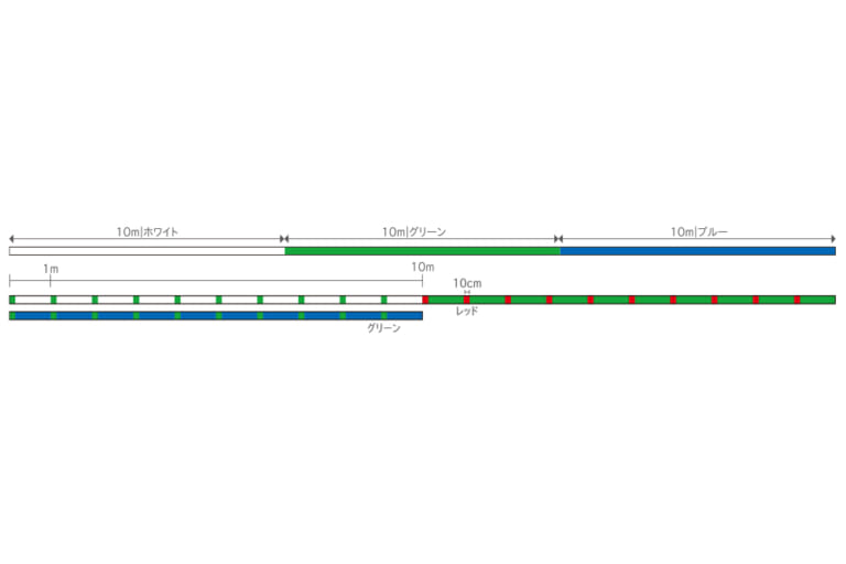 ラインカラーは10m毎3色(ブルー→グリーン→ホワイト)に1m毎10cmのマークが入る。