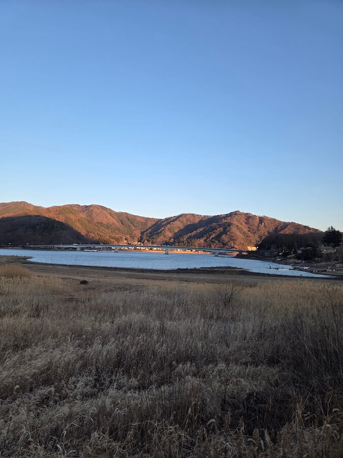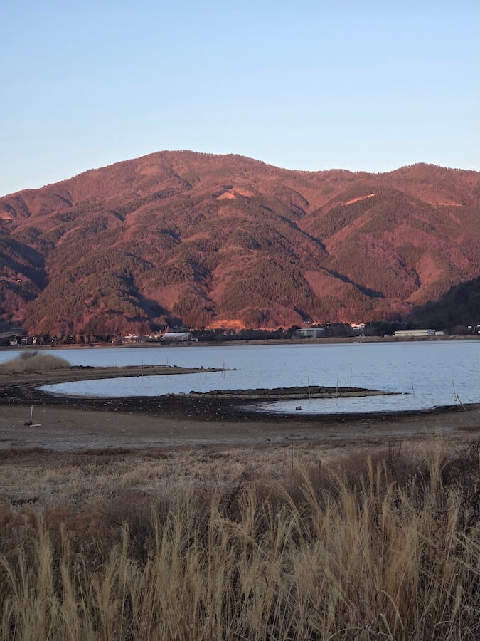 八木崎公園から見える、白須ワンドの中。ハンプがむき出しになってしまいました。2025年の年末よりさらに減水し、4mを越える減水に…。こんな光景は、河口湖に来てから初。