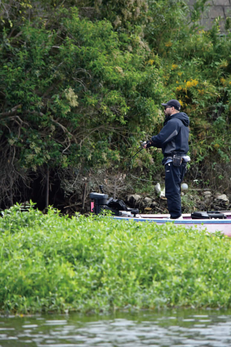この日、予想以上の大減水でシャローカバーを攻める展開に苦戦を強いられていた櫻井さん。狙いを定めたのは、すぐ近くに深場があるエリアだ。