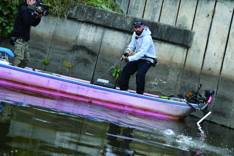 リサイクル工場前は魚影が濃いエリアだが、定番である水路のマウス付近では反応が薄い。そこで沖にボートをポジショニングして、シャッド(スピードキラー)を巻き始めた櫻井さん。はじめ、ナイロンラインのタックルで反応がなく、同lb数のフロロを巻いたタックルにチェンジすると2連発。「ラインの種類で潜行深度やボトムのタッチ感も変わってきます」。