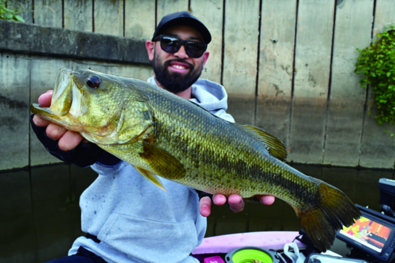 大減水への対応として、近くに深みがあるエリアだけに絞って時間帯を変えて何度も入り直す作戦がついに功を奏した。この日、まだ試していなかったボートポジションとトレースコースでブリッツDRを通すと一撃で食ってきた。