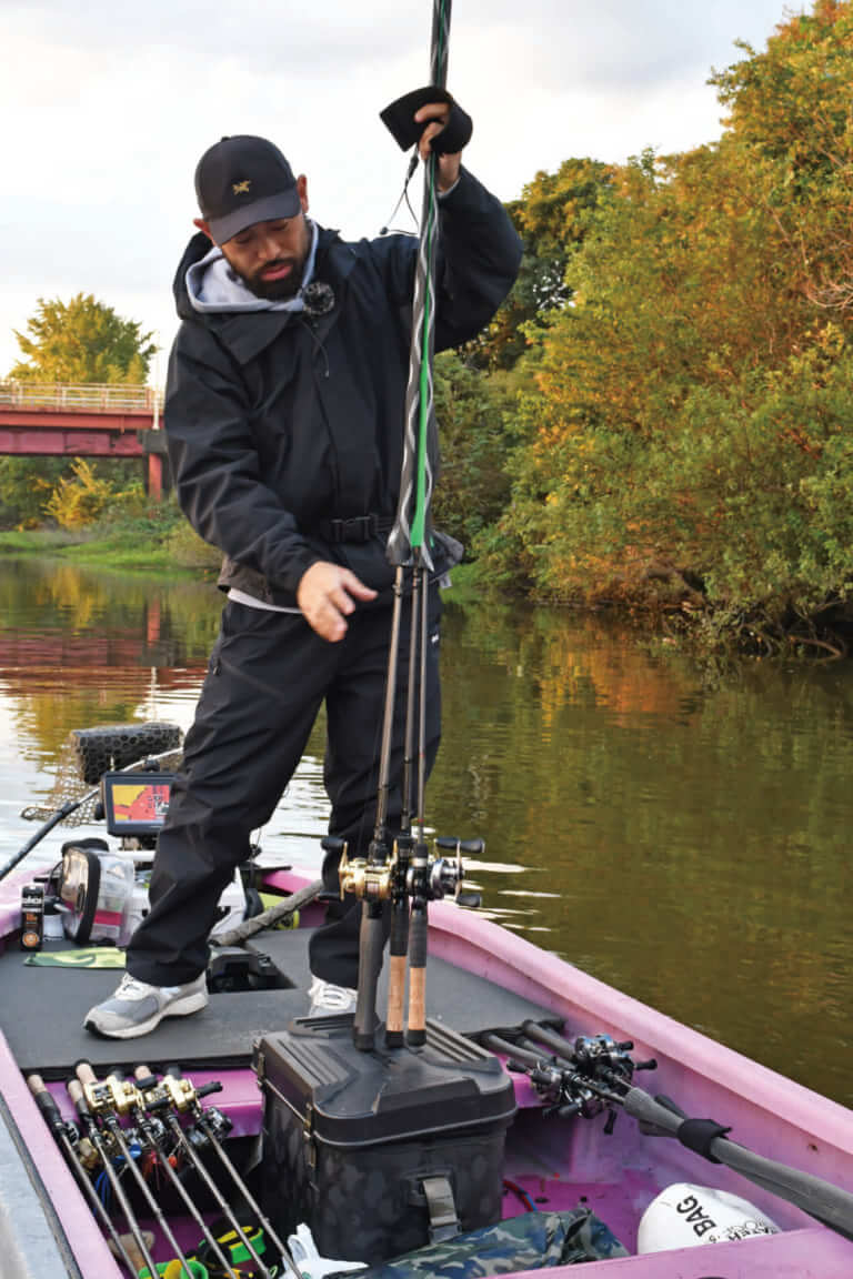 ロッドソックスでまとめられた3束のタックルをボートに持ち込んだ櫻井さん。その数なんと15本!「こんなに竿多いの、俺と(松本)幸雄さんくらいだから。2人で乗るときは『多いなぁ!!』って2人でガチャガチャやってますよ(笑)。投げたいときにルアーを付け直すのがいやなんです」。