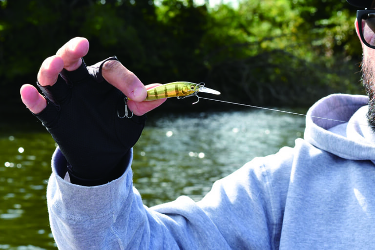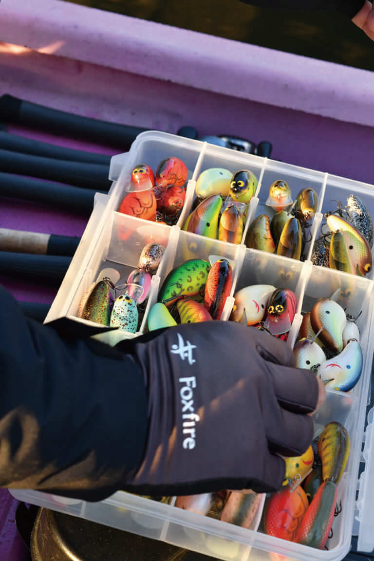 「僕がハードベイトで PE ラインを使うのは、トップウォーターやフラットサイドクランクのシェイキーなど操作系のルアーを使うときに限られます。僕は普段かなり柔らかい竿を使うのですが、伸びにくい PE ならしっかりロッドパワーが伝わります。各種リーダーの長さを変えることでルアーが潜る深度を調整させています」。