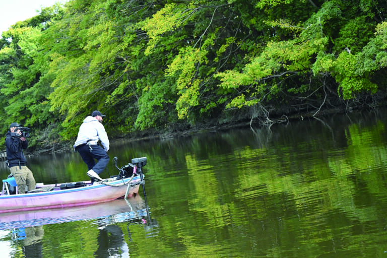 「まわりの釣り人を見ていると、けっこうラインの選び方が大雑把だなって思うことはあります。例えば、軽いルアーはナイロンラインのほうが投げやすい。スプールに14lbラインを50mくらい巻くとナイロンのほうがフロロより3~4gくらい軽くなるんです。低弾道でカバーの奥まで投げたいときもナイロン。重いフロロは飛んでいくルアーの下にラインが垂れ下がって追従し、逆にナイロンはルアーの真後ろにラインがあって垂れ下がらないイメージなので奥までルアーを入れやすいんです」。