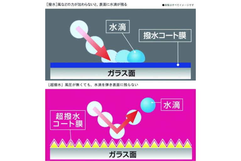 この『ゼロワイパー フィルムタイプ』は、表面に目には見えない超微細な突起を搭載。この突起のおかげで水滴が触れた瞬間に弾かれる仕組みになっており、悪天候時の視界を確保してくれる。