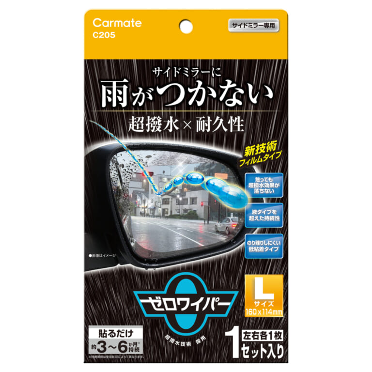 『ゼロワイパー フィルムタイプ』は、カー用品を発売するカーメイトの製品。サイドミラーに貼り付けだけで、雨粒や雪を弾いてくれるアイテムだ。