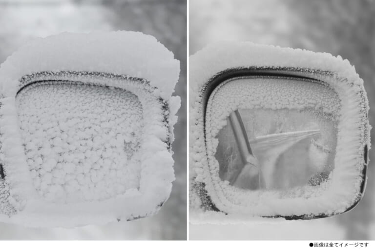 とくに、雪の日などは本当に厄介。固体の雪は液体の雨粒と違って、走行中にサイドミラーから剝がれづらく、ミラー全面に付着してしまうと完全に視界が失われてしまう。