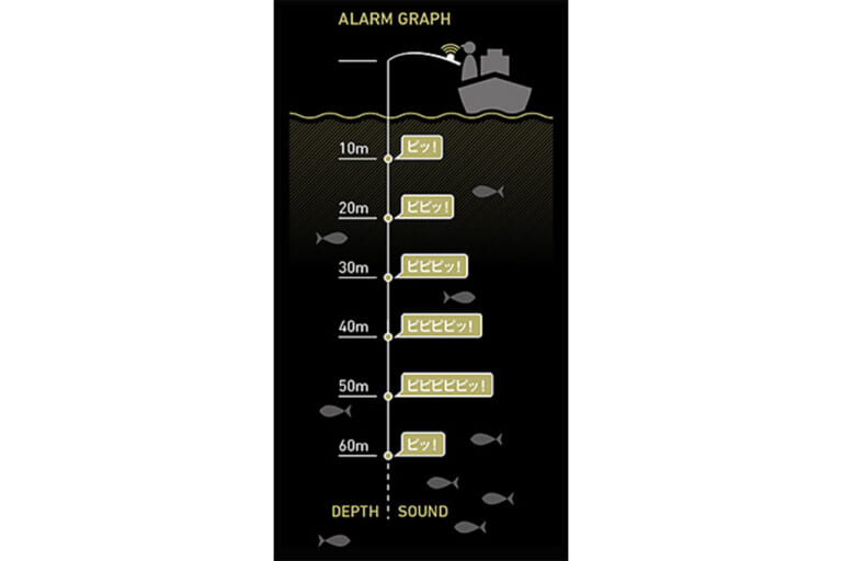 さらに進化した「デプスアラーム」は、10mごとの水深を音で知らせることで、目を離していても正確なタナを把握可能に。フォール・巻上げそれぞれでON/OFF設定ができる。