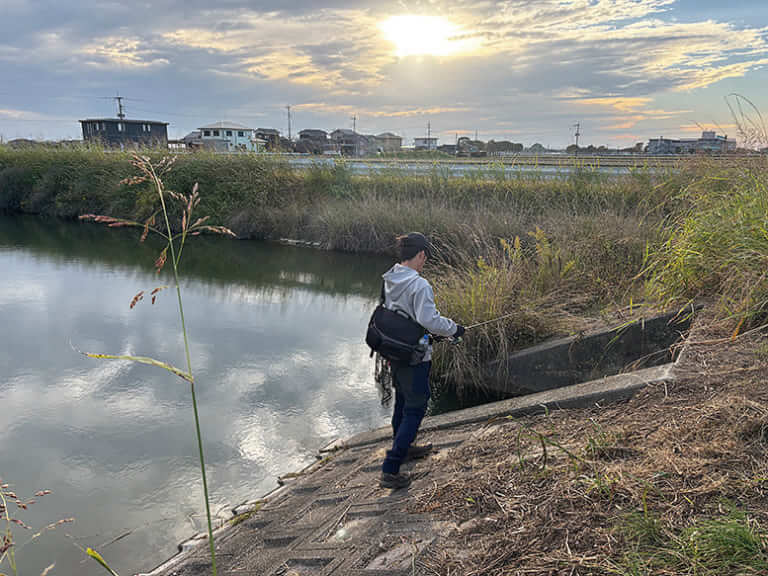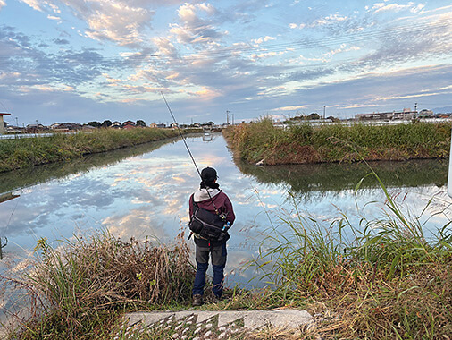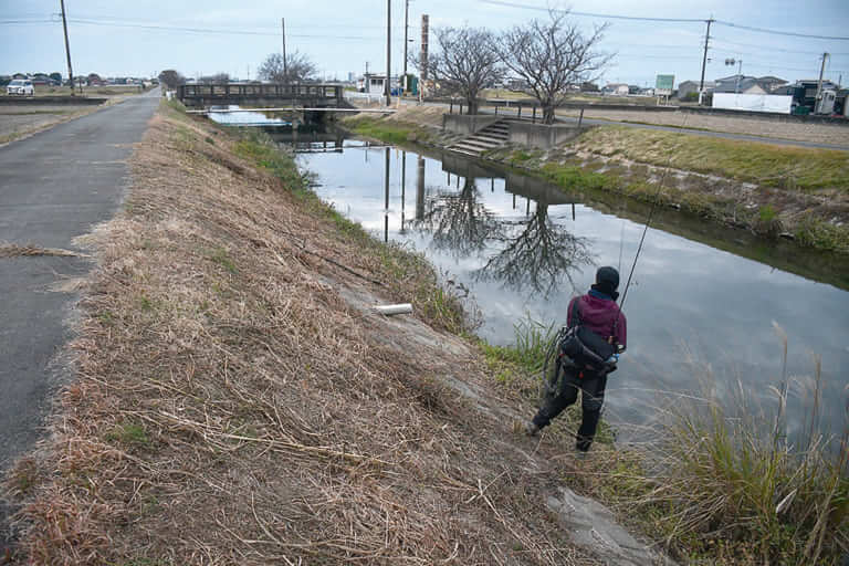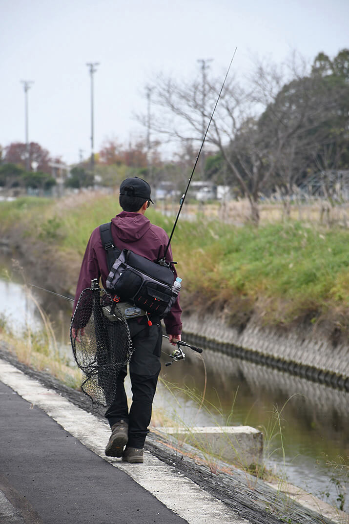 「九州のメジャーフィールドのなかで、これまで釣りをしたことがなかったのが柳川クリーク。こういう小規模な河川で釣りをするのは好きで、同じような景色が続くなかで、どうやって魚を絞り込んでいけるかというところに興味が湧きました。前日にけっこう冷え込んで、この地域では今年一番の気温の低さらしいです。この冷え込みがどう影響しているのかも含めて、今日一日見ていこうかと思います」。