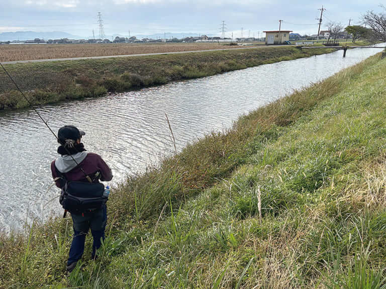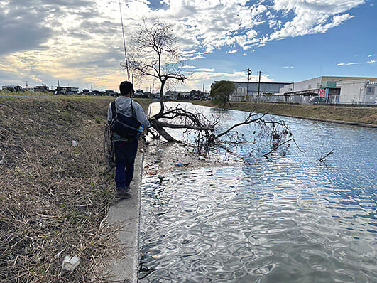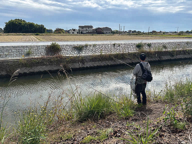 足を使っていろいろな水路をチェックしていく。魚が濃いエリアと薄いエリアが、おおよそつかめてきた。しかし、この広大なフィールドにやや精神がやられ気味⋯。「どこまでやればいいんだろう⋯。同じ景色が続き過ぎて、ちょっと疲れてきますね(笑)」。