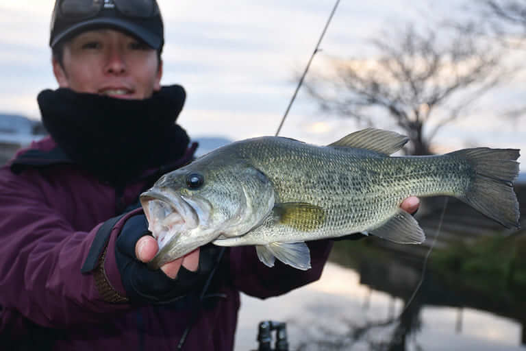 納竿間近、スティーズクランポを岸際と平行に流して、細かいトゥイッチで誘っていくと、グッドサイズがヒット。「エビ食い系が多い印象だったから試したら、やっぱり食いました。この時期でもトップ出ますね」。