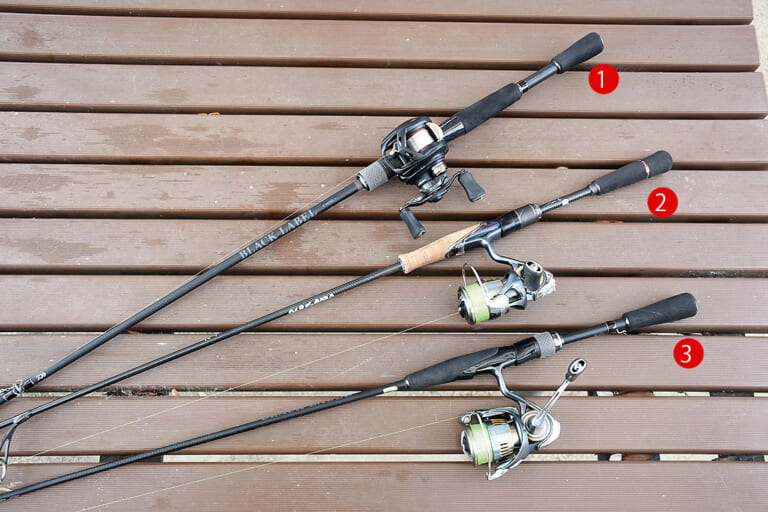 ❷シュリンピードJr.用 ●ロッド:スティーズSC S69ULキングボルトフィネススペック69 ※プロト ●リール:エアリティLT2500S XH ●ライン:PEデュラセンサー×12EX+Si3 0.6号、フロロリーダー1.5号